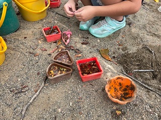 秋風が吹く中、砂場で子ども達は木の枝や葉っぱを集めて、お店屋さんを始めました。