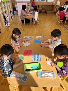 折り紙を折って着物を作ったり、クレヨンで顔を描いたりし、髪の毛や小物などは指のりでのり付けをしました。