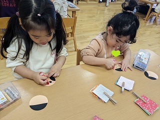 1の指に少しのりを付けて細かいものもきれいに貼ることが出来るようになりました。